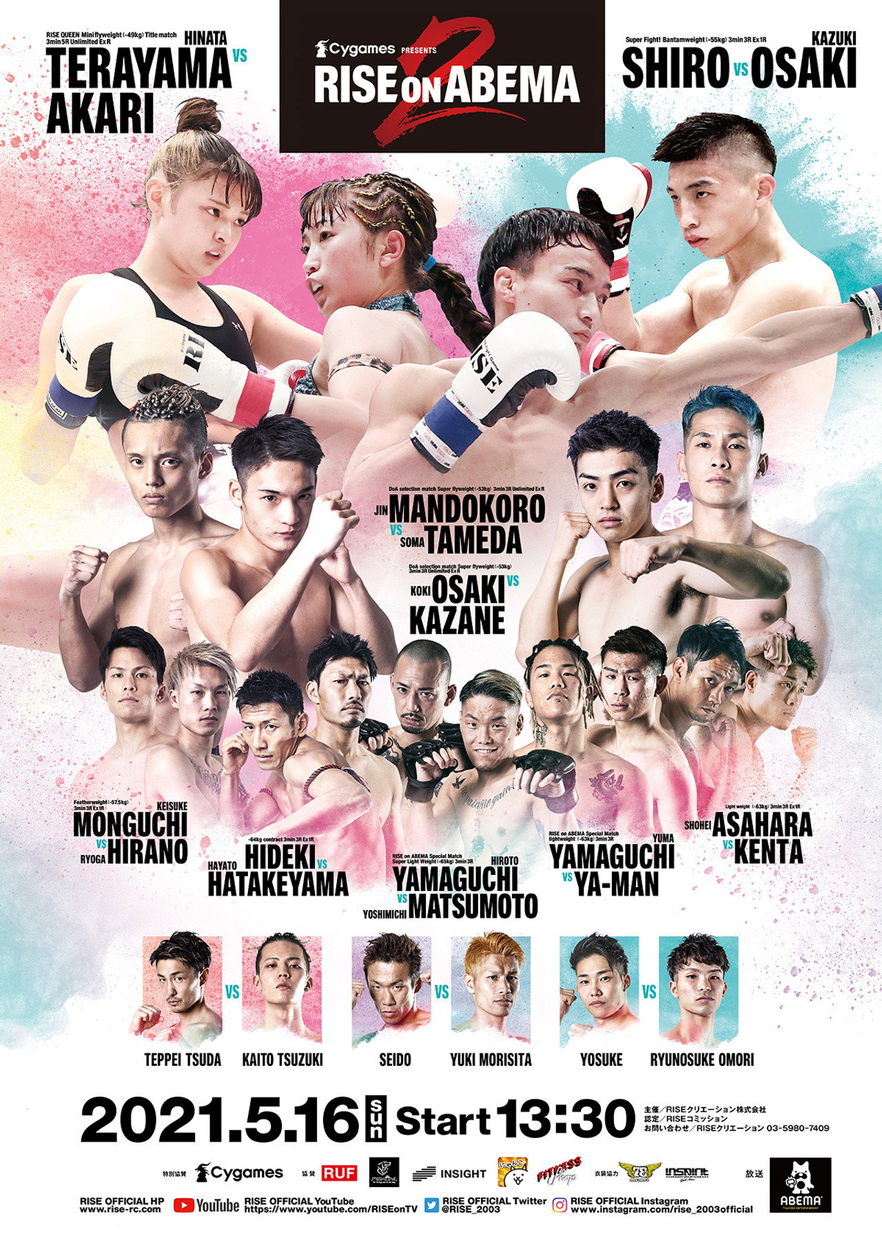 Cygames presents RISEonABEMA 2021 takes place on May 16, 2021, at a private venue in Tokyo, Japan, with no audience due to restrictions. This kickboxing event features Hinata Terayama defending her RISE QUEEN Mini Flyweight title against AKARI in the main event. Other bouts include Koki Osaki vs. Kazane Nagai and Jin Mandokoro vs. Soma Tameda in Super Flyweight DoA selection matches. An exhibition match showcases Shiro vs. Kazunari Ishii, alongside open-finger glove fights like Kento Haraguchi vs. “Black Panther” BeyNoah.