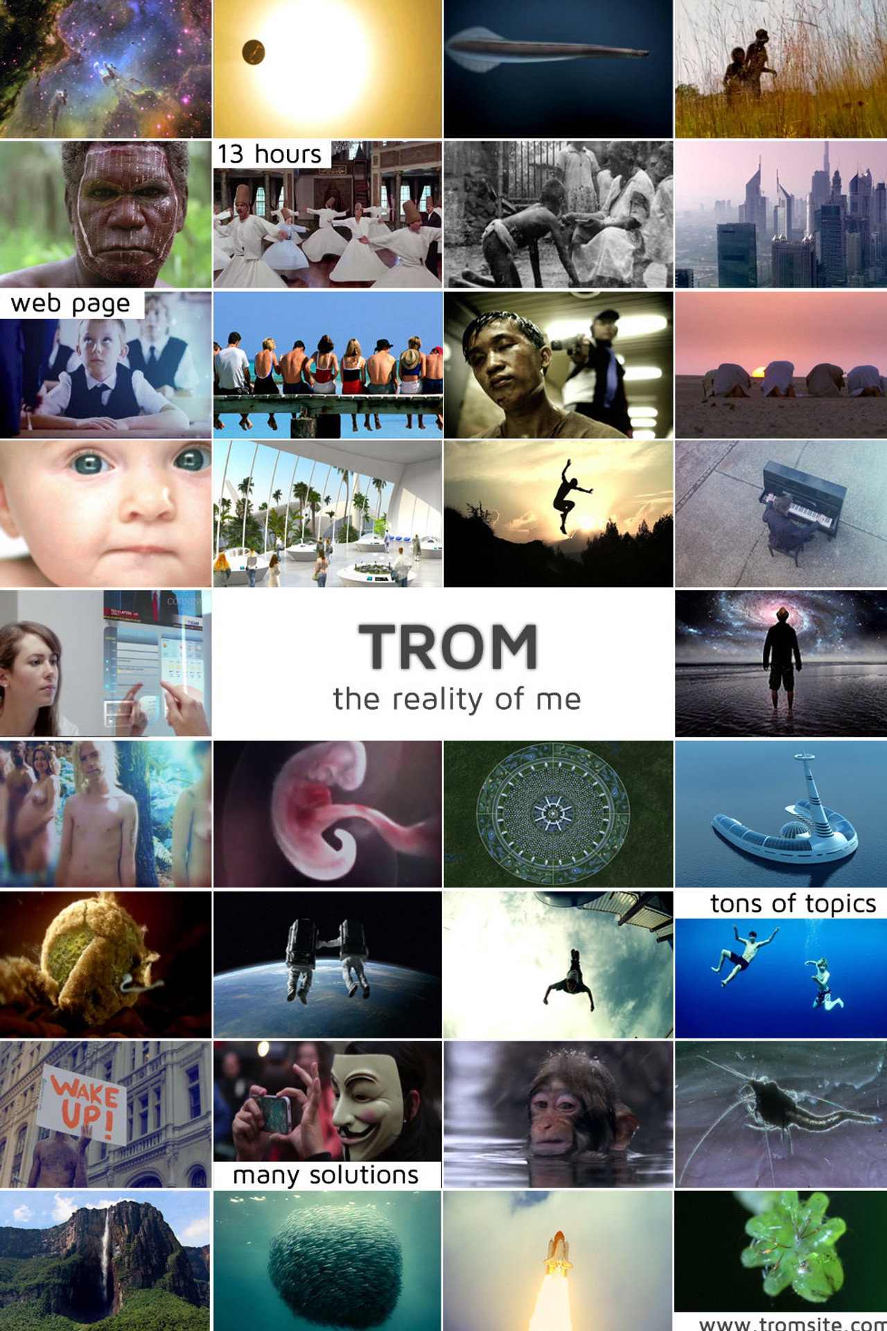 TROM (The Reality of Me) is an unique free online documentary, since no one has thought of such a documentary from our knowledge. We want to show, as well as we can, the whole picture, an insight into our world, a perspective from which you must extract meanings in order to understand, and curiosity to progress, because there is a lot of such information we call “scientific”. Moreover, we present alternative and existing solutions to radically improve every one's life. If you've never questioned your lifestyle and are well adjusted to our current society, you will, more than likely, get a shock, but if you watch the whole documentary you'll understand why. All chapters and sub-chapters are connected and in order to understand you have to watch the whole documentary, in order.