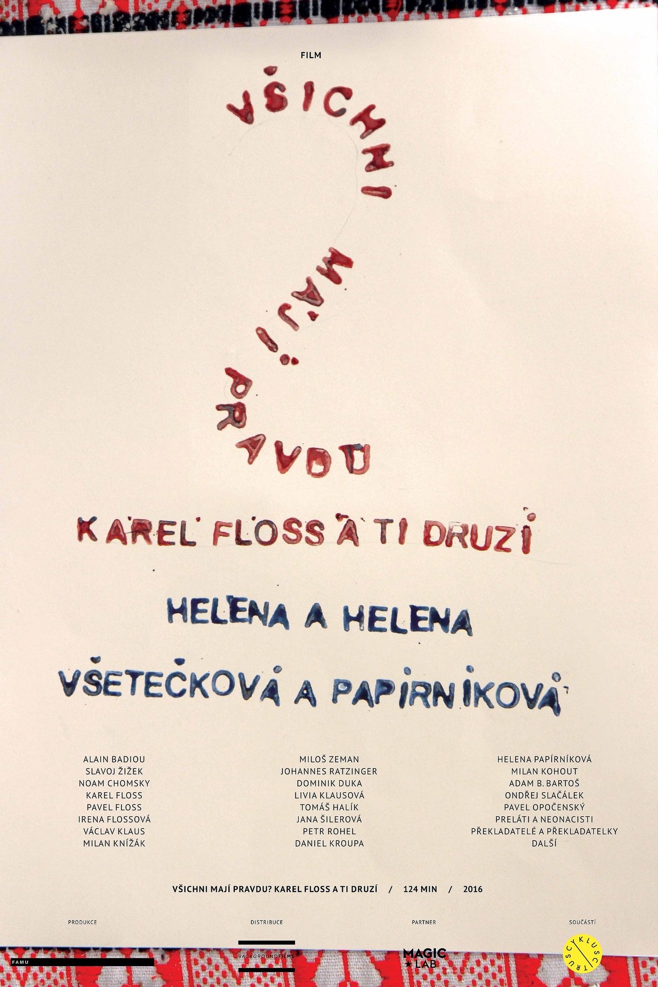 A multi-portrait of the history of post-1989 Czech ideas and sensibilities, centered around left-wing Christian philosopher Karel Floss. Circling his ideas on God, truth, and politics like satellites are statements by strongly antithetical individuals including Milan Knížák, Ondřej Slačálek, Noam Chomsky, and Czech nationalist thinkers. Working with a subtle sense of irony, the film is openly inspired by the style of Karel Vachek as it makes use of semantic counterpoints, situational humor and aloof formal elements. The result is a kind of audiovisual riverbed for channeling the fury of a nation that recalls a child that is just learning to think and does not know what to relate to first, because in a certain sense, basically “everyone is right”.