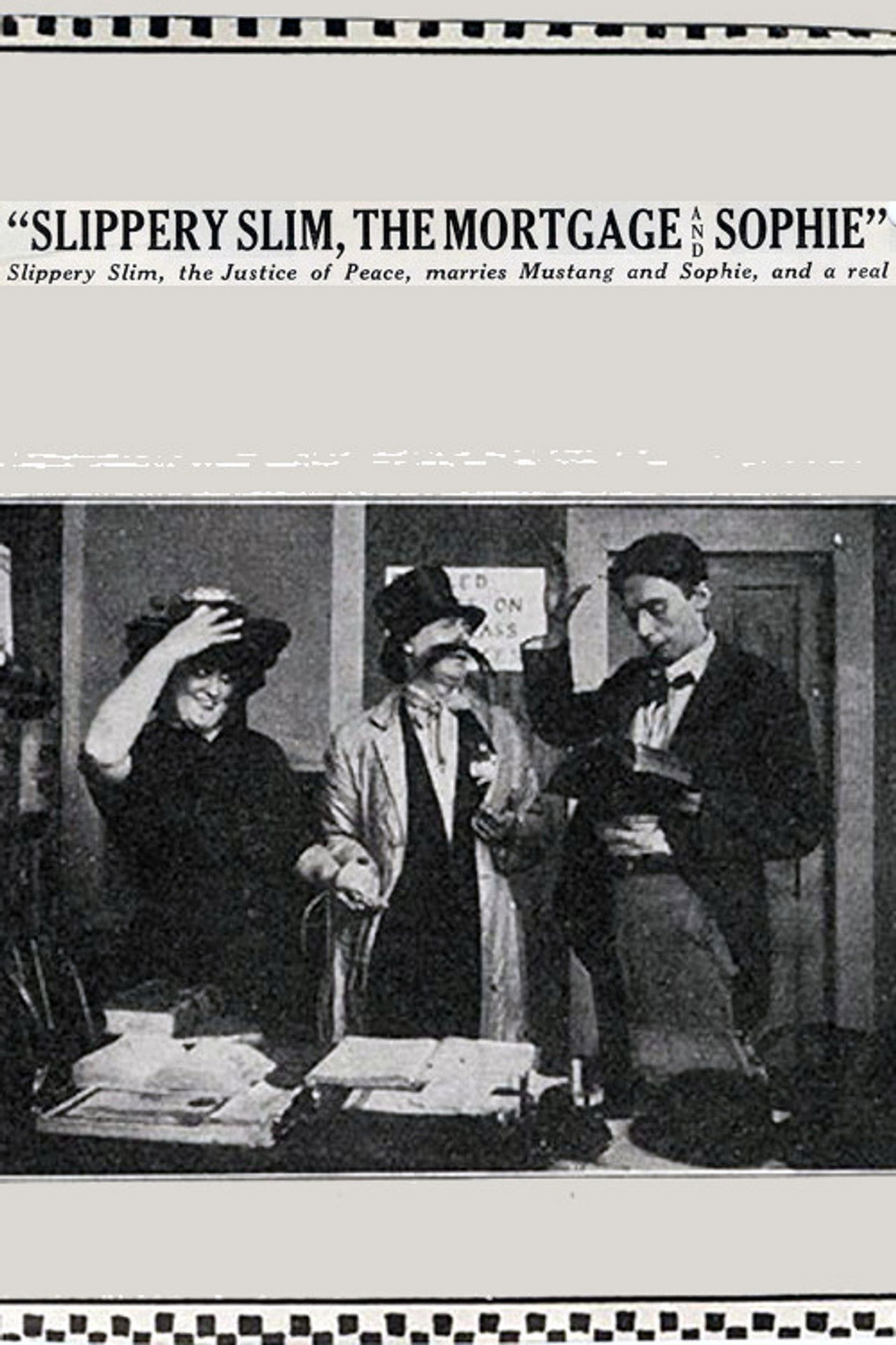 Slippery Slim, the Justice of the Peace, serves a notice on Hiram Clutts, threatening to foreclose his mortgage unless Sophie marries him the next day. Hiram agrees that Sophie shall marry him as he demands. Sophie tells Mustang of this and they plan to elope that night. Mustang calls for her in his buggy, but they fail to make their escape unnoticed by Hiram. He chases them with a shotgun, but is unable to catch them before they reach Slim's office. They disguise themselves and Slim, not knowing who they are, performs the marriage ceremony.