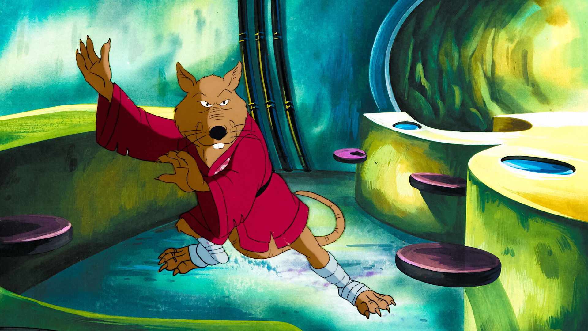 Four turtles fall into the sewers and are befriended by Hamato Yoshi a Japanese man sent to New York who was forced to live in the sewers. One day he sees a strange green glow which transforms the four turtles into human-like creatures. Hamato (now Master Splinter) changes into a giant rat from the green glow and teaches the turtles the skills of the ninja as they team up with news reporter April O'Neil to battle against Yoshi's arch enemy Shredder and Krang, an alien warlord from Dimension X.